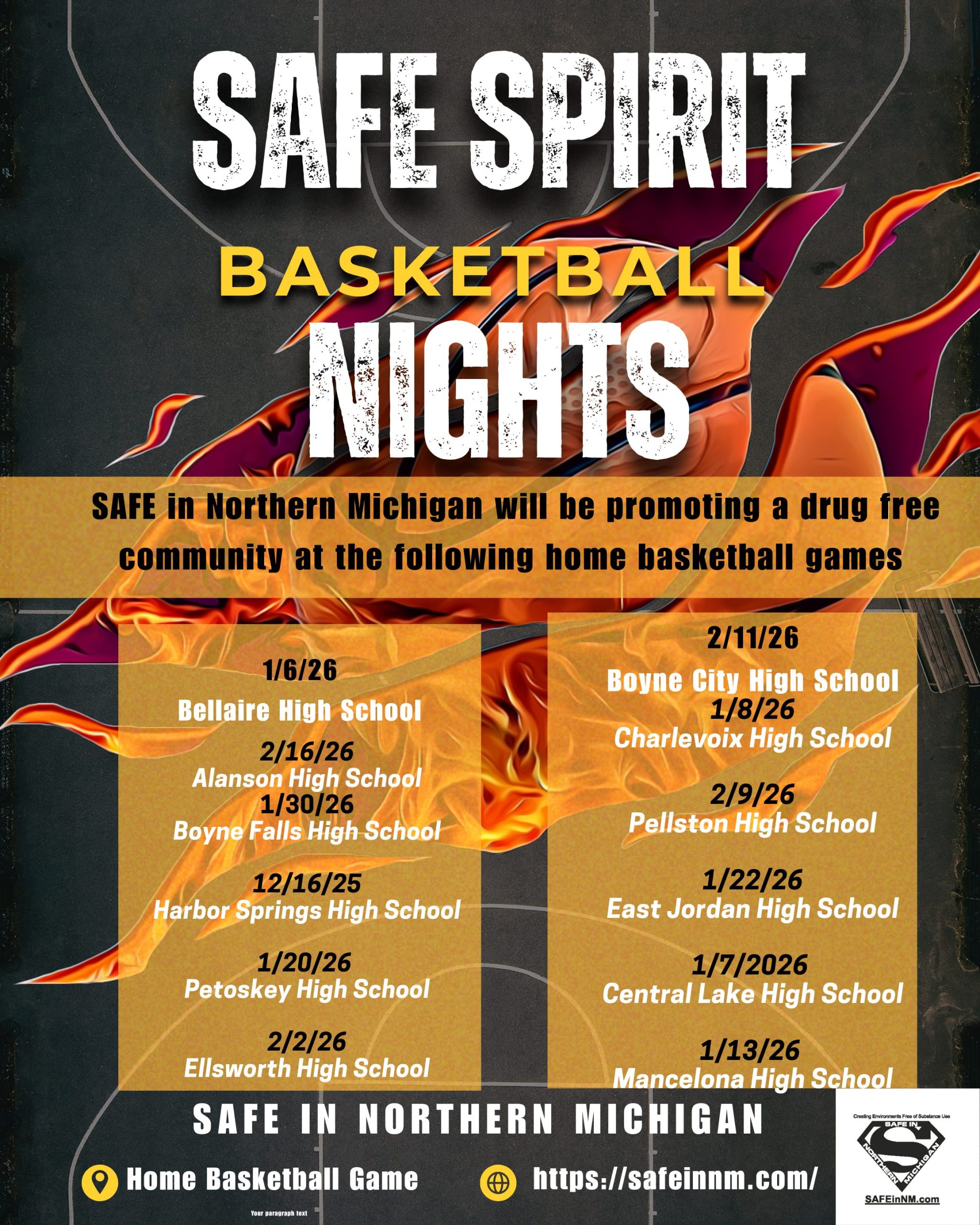 SAFE Spirit Basketball Nights are coming! Find your school’s date—check the flyer and join the fun!