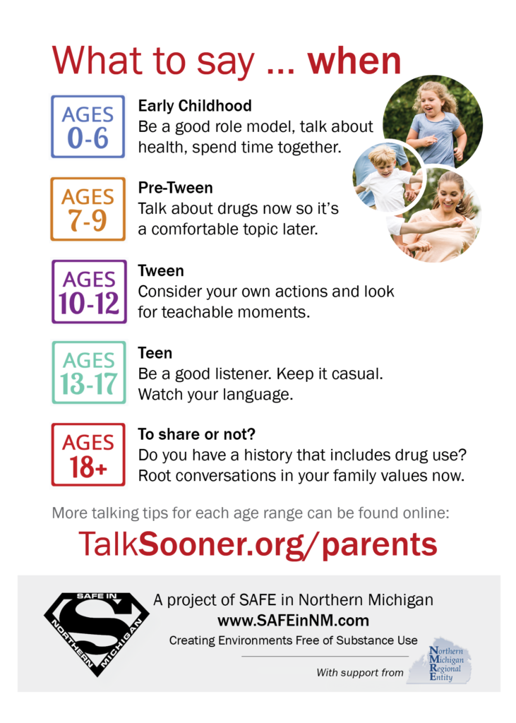The SAFE Collaborative has partnered with a new organization, the Talk Sooner campaign for a new project that encourages parents to begin having important conversations with their children starting at a young age. Talk Sooner gives parents talking points and ideas for conversations at all age ranges. To help parents and caregivers remember to have these conversations, SAFE has sent out postcards to all students in grades 3-5 throughout Char-Em ISD schools. Yard signs were placed at schools and organizations in late April 2019 as well. Visit https://talksooner.org/ to get started in learning how and what to say to your children, and when.
